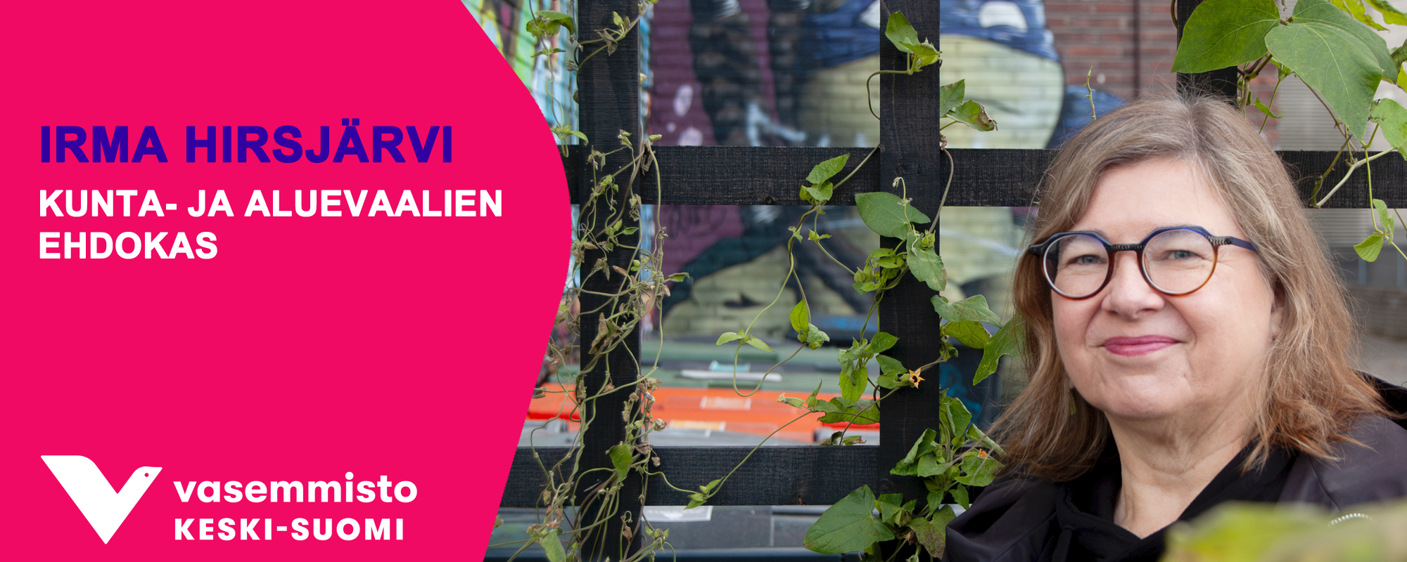 Olen Irma ”Ipa” Hirsjärvi, väitellyt nykykulttuurin tutkija, opettaja ja kirjoittaja. Olen Työttömien Keskusjärjestön hallituksen puheenjohtaja, Keski-Suomen aluevaltuutettu, aluevaltuuston tarkastuslautakunnan varapuheenjohaja, ja Jyväskylän kaupunginhallituksen varajäsen. Olen aktivisti ja kulttuurin monitoimikone. Lähde tukemaan kampanjaani! Näiltä sivuilta löydät lisää minusta, tekemisistäni ja toiminnastani.